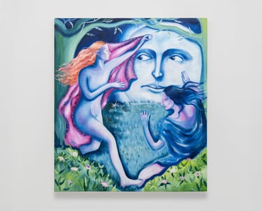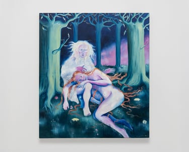 The piece portrays two young women lying in a meadow, their figures blending harmoniously with the surrounding landscape. The red hair of one of the girls spreads out like roots, intertwining elements of life and nature in a silent, profound dialogue.