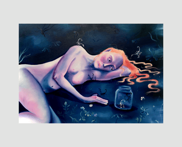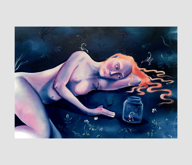 The composition is dominated by the figure of a young woman lying down, interacting with a series of scorpions emerging from a jar.