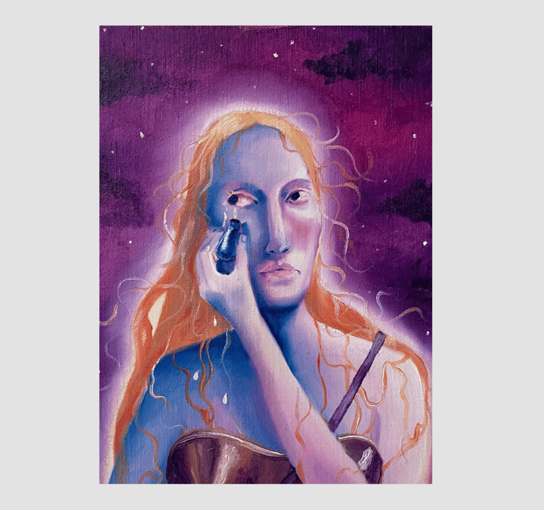 Through this tension between historical reality and myth, the painting explores themes of memory, sorrow, and the complex relationship between mourning and its material expression, offering a reflection on the emotional weight of tears and the rituals that accompany them.